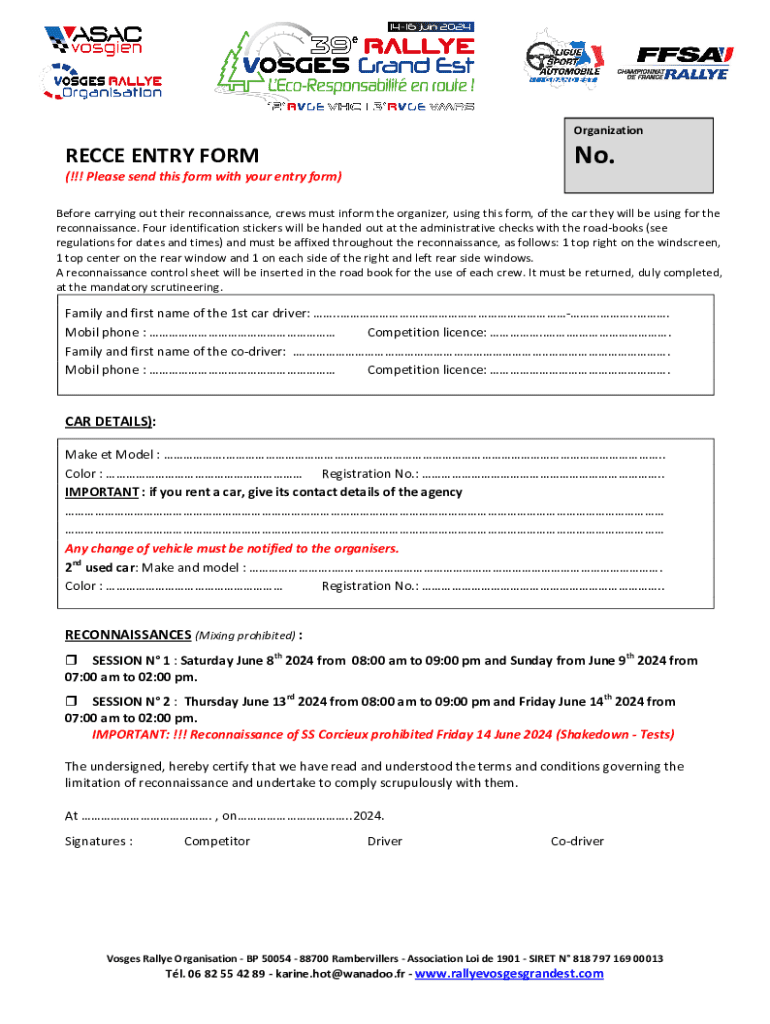 Complete the 2024 RECCE Entry Form for Vosges Rallye to register your vehicle and ensure compliance. Submit before June sessions for smooth participation.