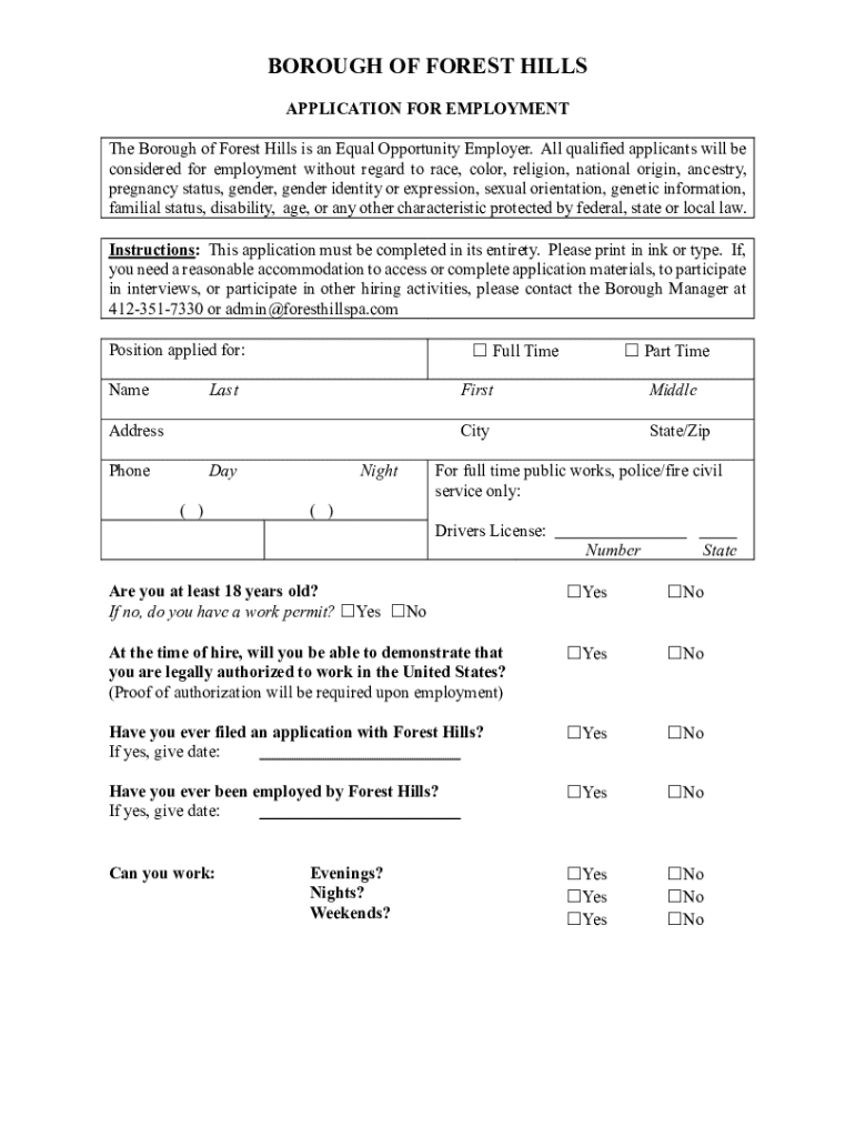 Fill out the Borough of Forest Hills Employment Application. Equal Opportunity Employer considering all qualified applicants without bias. Contact for assistance.