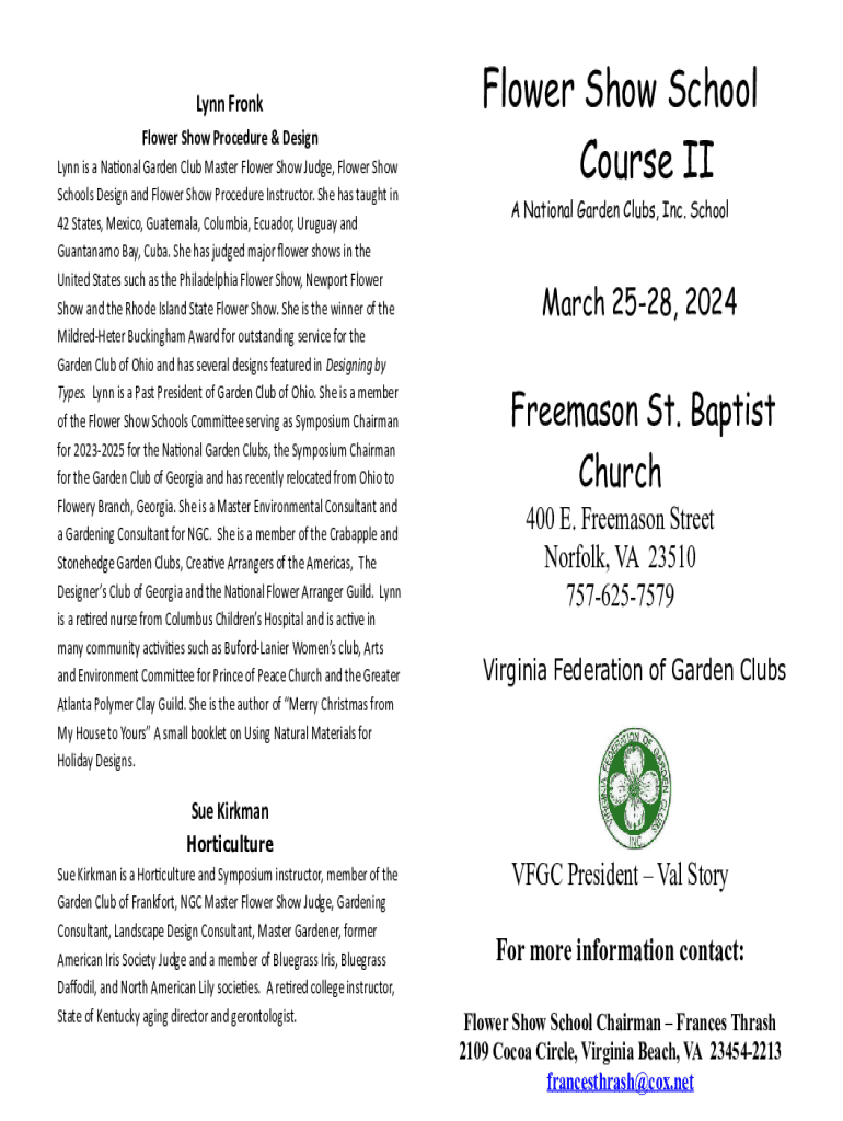 Join Lynn Front and Sue Kirkman at the Flower Show School Course II in Norfolk, VA, from March 25-28, 2024, to learn design and horticulture. Register now!