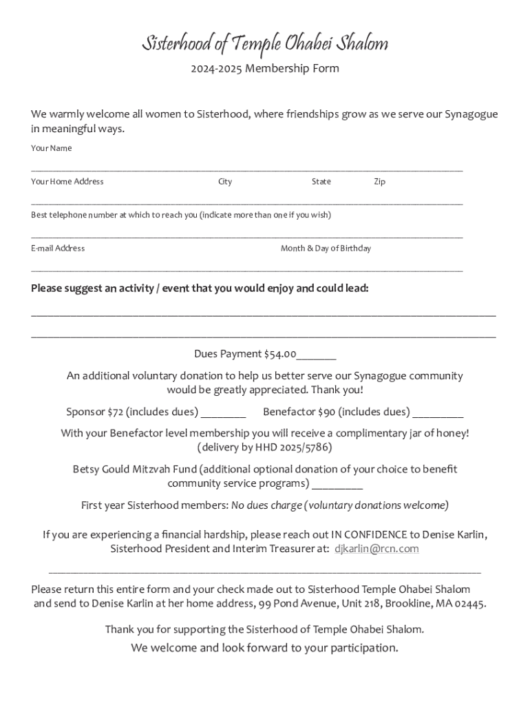 Join the Sisterhood of Temple Ghana Shalom for 2024-2025. Experience community, support, and friendships. Your participation matters in our synagogue!