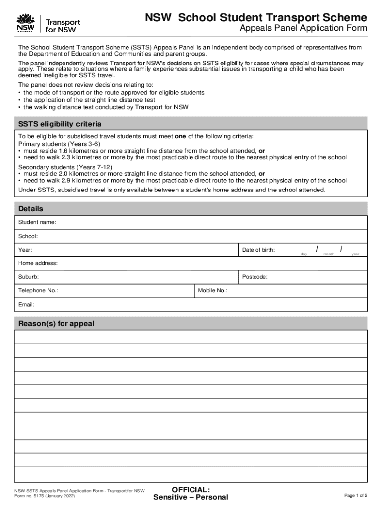 Apply for the NSW School Student Transport Scheme Appeals Panel to review SETS eligibility decisions for special circumstances. Form 5175 details included.