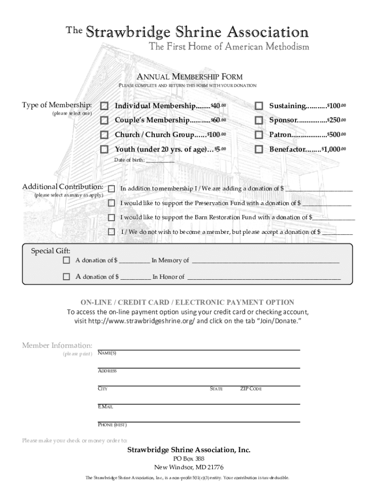 Join the Strawbridge Shrine Association with various membership options. Donations help preserve American Methodism\'s first home. Support today!