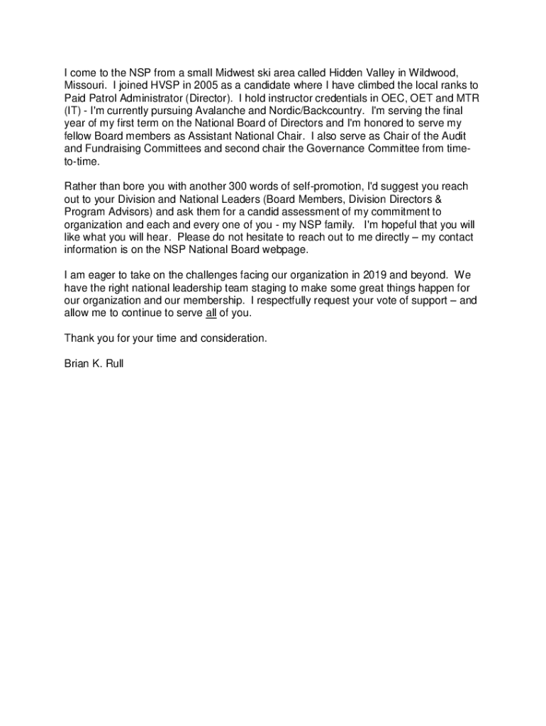 Brian K. Rull\'s candidate application for the NSP Board of Directors, detailing leadership experience, commitment to NSP, and fundraising initiatives.