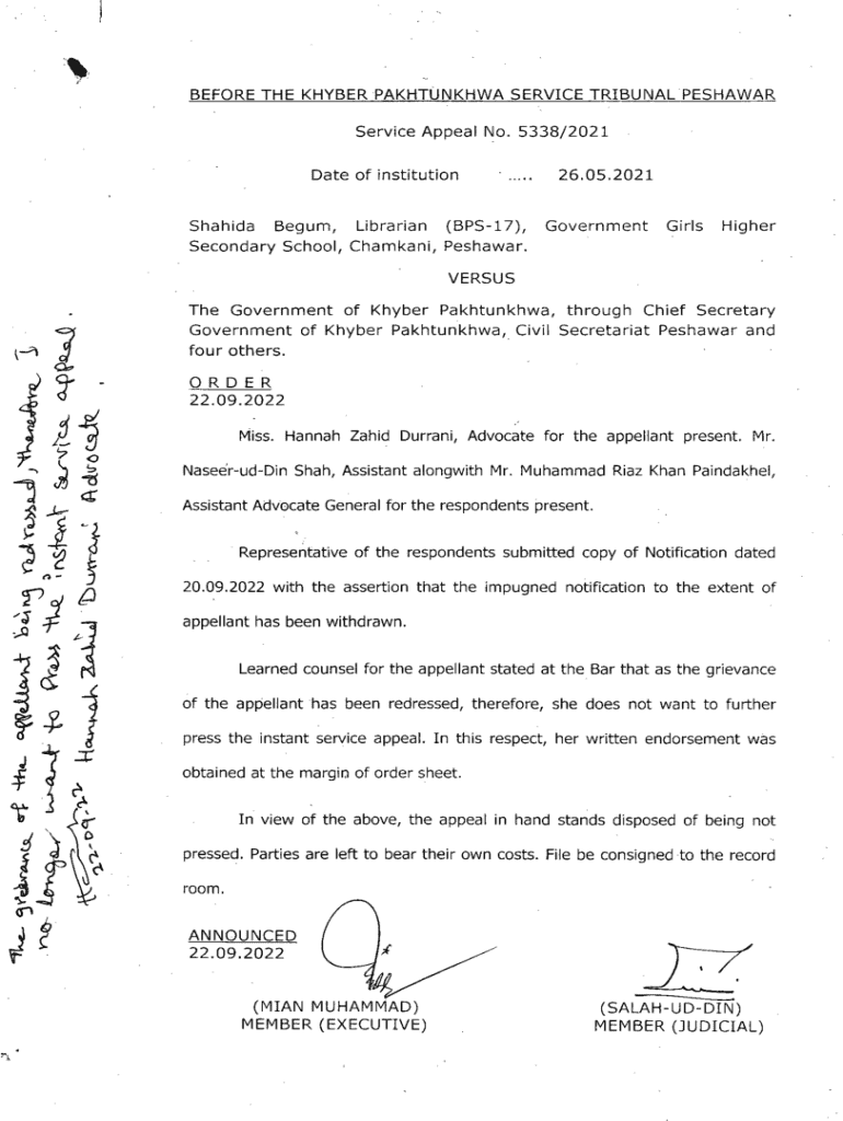 %BEFORE THE KHYBER PAKHTUNKHWA SERVICE TRIBUNAL PESHAWAR Service Appeal No. 5338/2021 Date of institutionShahida Begum, Librarian (BPS17), Secondary School, Chamkani, Peshawar.26.05.2021 GovernmentGirlsHigherVERSUS The Government of Khyber Pakhtunkhwa, through Chief Secretary Government of Khyber Pakhtunkhwa, Civil Secretariat Peshawar and four others. ORDER22.09.2022 Miss. Hannah Zahid Durrani, Advocate for the appellant present. Mr. NaseerudDin Shah, Assistant alongwith Mr. Muhammad