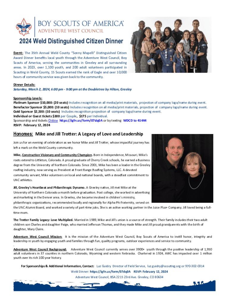 2024 Weld Distinguished Citizen Dinner Event: The 35th Annual Weld County Sonny Capella Distinguished Citizen Award Dinner benefits local youth through the Adventure West Council, Boy Scouts of America,