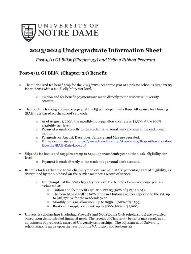 2023/2024 Undergraduate Information Sheet Post9/11 GI Bill (Chapter 33) and Yellow Ribbon Program Post9/11 GI Bill (Chapter 33) Benefit The tuition and fee benefit cap for the 2023/2024 academic year