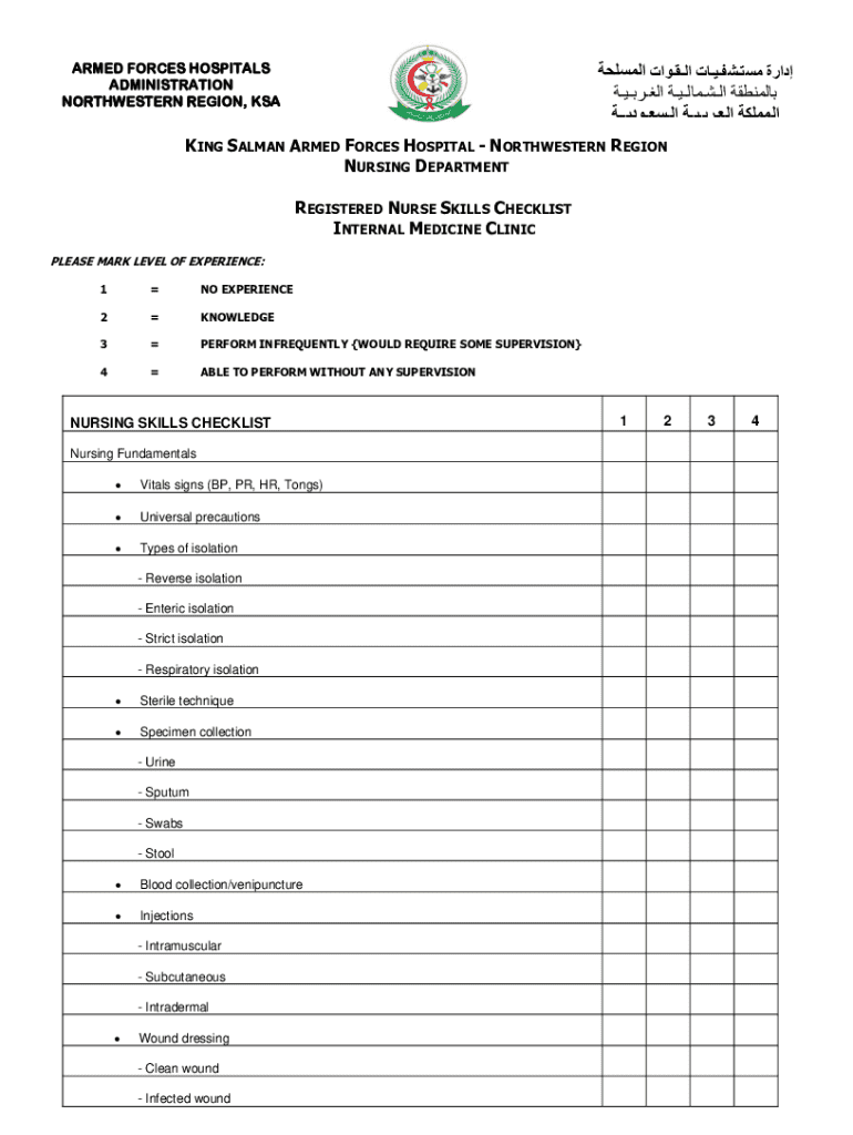 ARMED FORCES HOSPITALS ADMINISTRATION NORTHWESTERN REGION, KSA KING SALMAN ARMED FORCES HOSPITAL NORTHWESTERN REGION NURSING DEPARTMENT REGISTERED NURSE SKILLS CHECKLIST INTERNAL MEDICINE CLINIC PLEASE
