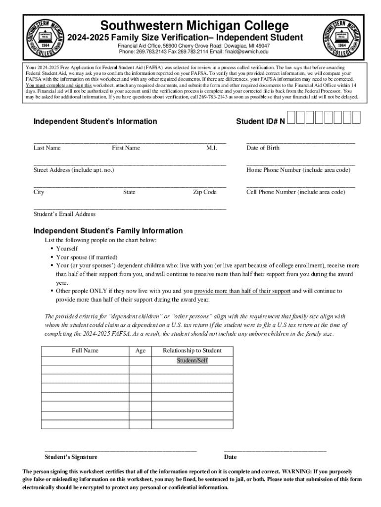 Southwestern Michigan College20242025 Family Size Verification Independent Student Financial Aid Office, 58900 Cherry Grove Road, Dowagiac, MI 49047 Phone: 269.783.2143 Fax 269.783.2114 Email: finaid@swmich.edu