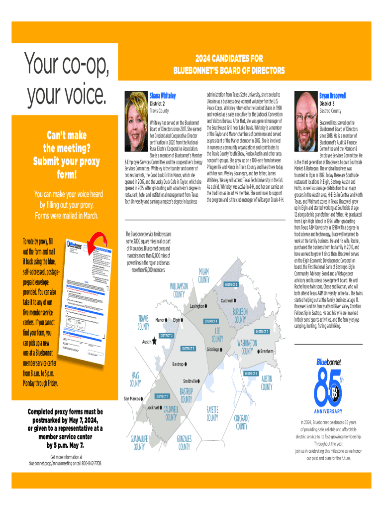 Your coop, your voice.You can make your voice heard by filling out your proxy. Forms were mailed in March. Election Validation Num/o Election Servi P.O. Box 9020 ces Corp. Ronkonkoma, NY 11779982 2berVOTINGcVOTING BY PROXYINSTRUCShana Whit (incumbent eley *)BryanBrace *As the elect (incumbent well ion for each *) Article II, Secti of on 6 of BluebDistricts 2 and 3 was uncontested, onnets Bylaw the incumbents s. STE P 3: will be elect Sign ed by gene ral consent If you