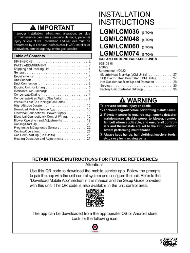 IMPORTANTImproper installation, adjustment, alteration, service or maintenance can cause property damage, personal injury or loss of life. Installation and service must be performed by a licensed