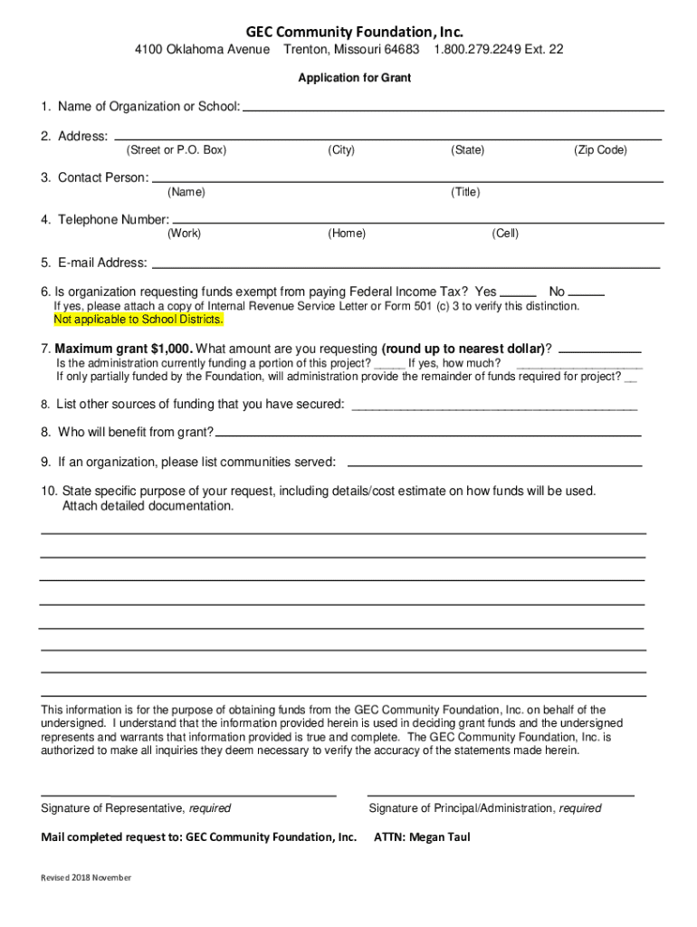 Submit your grant request to GEC Community Foundation for funding up to $1,000. Detailed instructions and documentation required for application.