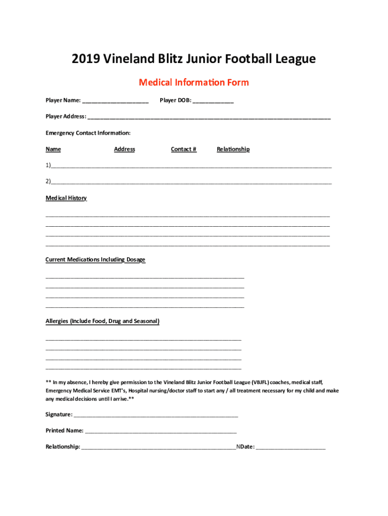 Complete the 2019 Vineland Blitz Junior Football League Medical Information Form for player details, emergency contact, medical history, and treatment permission.