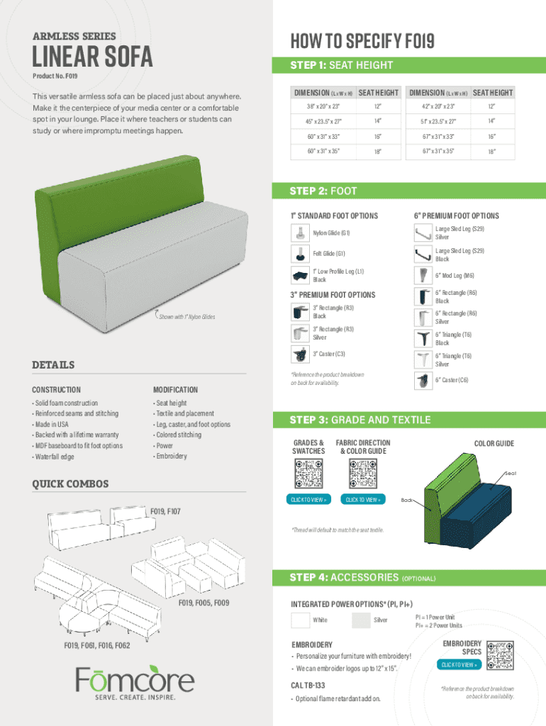 Discover the versatile F019 armless linear sofa specifications, featuring multiple dimensions, seating heights, and custom options for your space in 2023.