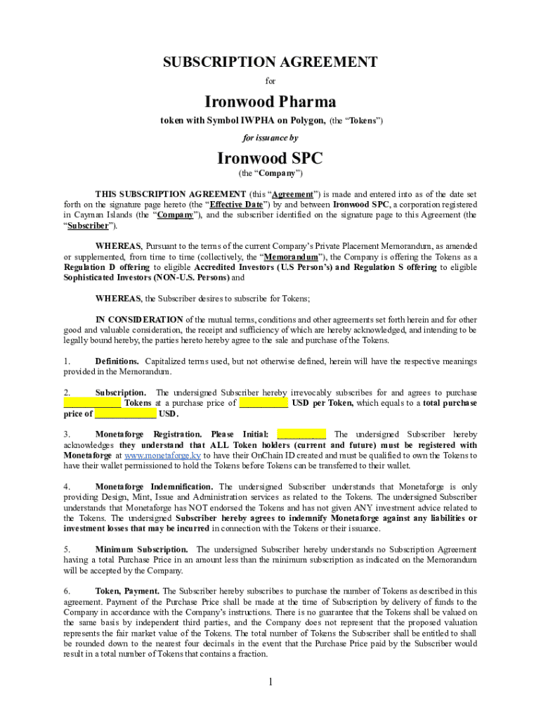 SUBSCRIPTION AGREEMENT forIronwood Pharma token with Symbol IWPHA on Polygon, (the Tokens) for issuance byIronwood SPC (the Company) THISSUBSCRIPTIONAGREEMENT(thisAgreement)ismadeandenteredintoasofthedateset f orthonthesignaturepagehereto(theEffectiveDate)byandbetwee