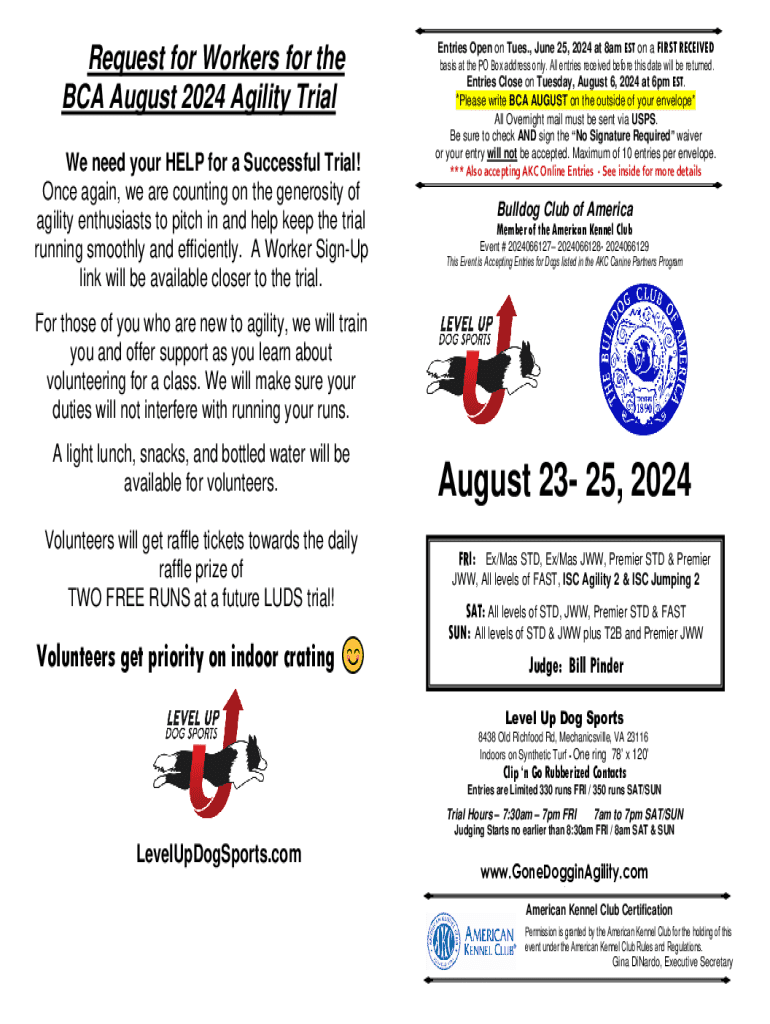 Request for Workers for the BCA August 2024 Agility Trial We need your HELP for a Successful Trial! Once again, we are counting on the generosity of agility enthusiasts to pitch in and help keep the