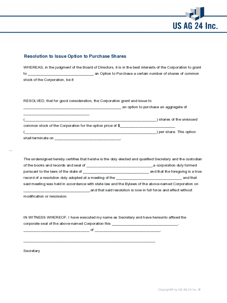 Resolution to Issue Option to Purchase Shares WHEREAS, in the judgment of the Board of Directors, it is in the best interests of the Corporation to grant to ___ an Option to Purchase a certain number
