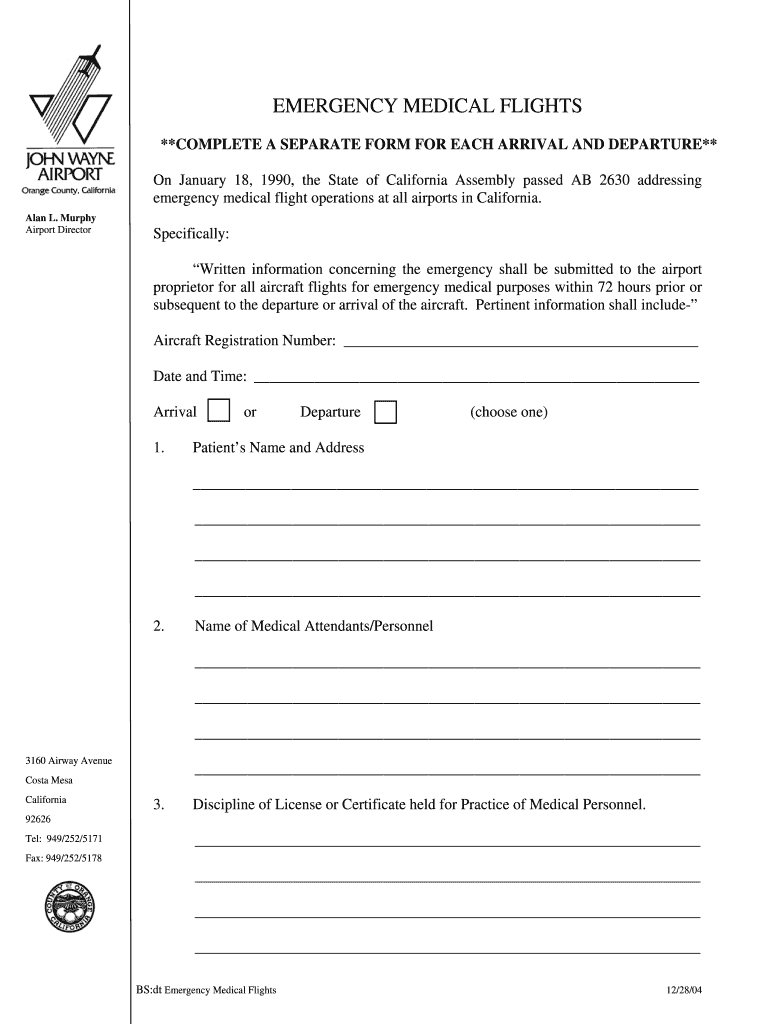 EMERGENCY MEDICAL FLIGHTS **COMPLETE A SEPARATE FORM FOR EACH ARRIVAL AND DEPARTURE** On January 18, 1990, the State of California Assembly passed AB 2630 addressing emergency medical flight operations