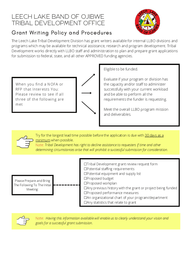 LEECH LAKE BAND OF OJIBWE TRIBAL DEVELOPMENT OFFICE Grant Writing Policy and Procedures The Leech Lake Tribal Development Division has grant writers available for internal LLBO divisions and programs