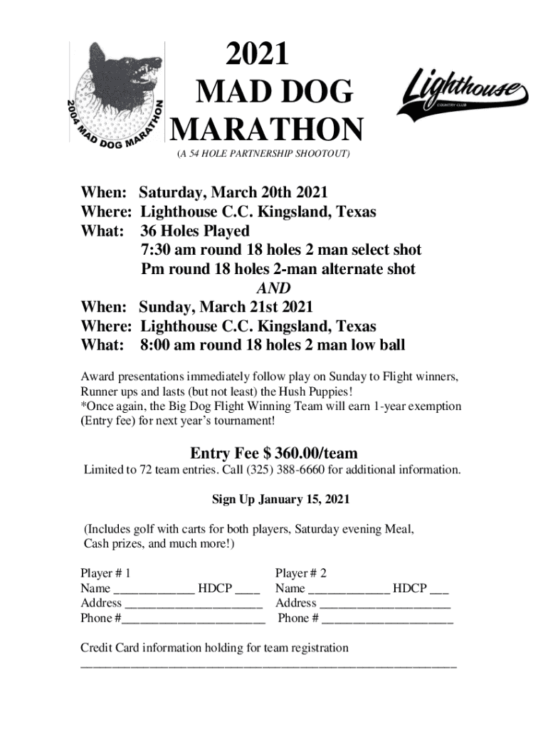Join the 2021 Mad Dog Marathon, a thrilling 54 hole partnership shootout at Lighthouse C.C. in Kingsland, Texas. Limited team entries, sign up today!
