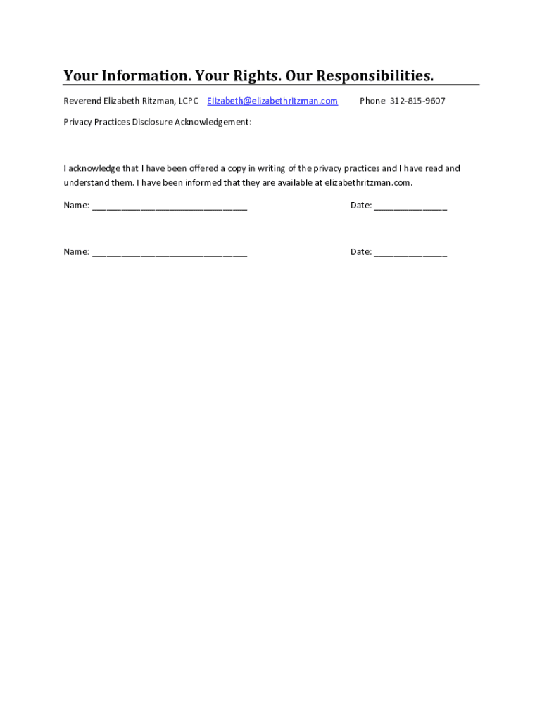 Your Information. Your Rights. Our Responsibilities. Reverend Elizabeth Ritzman, LCPC Elizabeth@elizabethritzman.comPhone 3128159607Privacy Practices Disclosure Acknowledgement:I acknowledge that