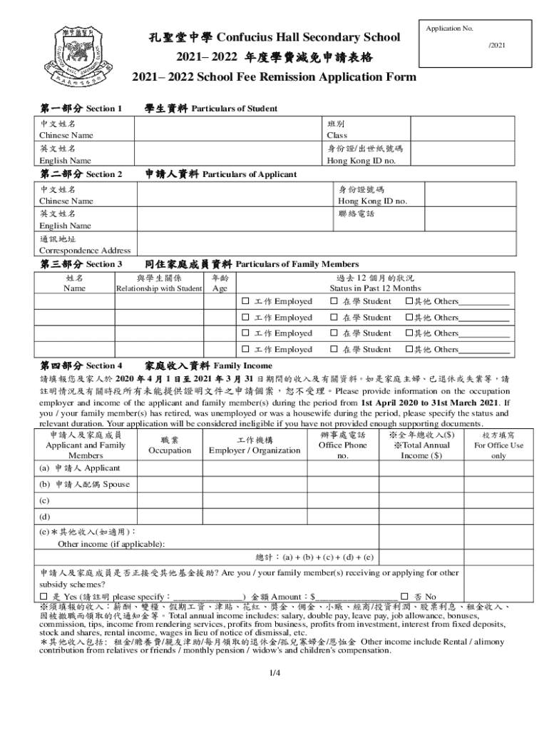 Apply for school fee remission at Confucius Hall Secondary School for the 2021-2022 academic year. Complete required sections and submit necessary documents.