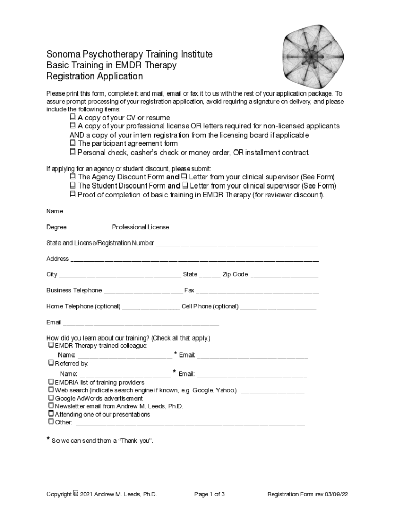 To fill out basic training in EMDR, participants typically need to complete an application form provided by their training organization, providing details about their professional background and completing the training modules as outlined.