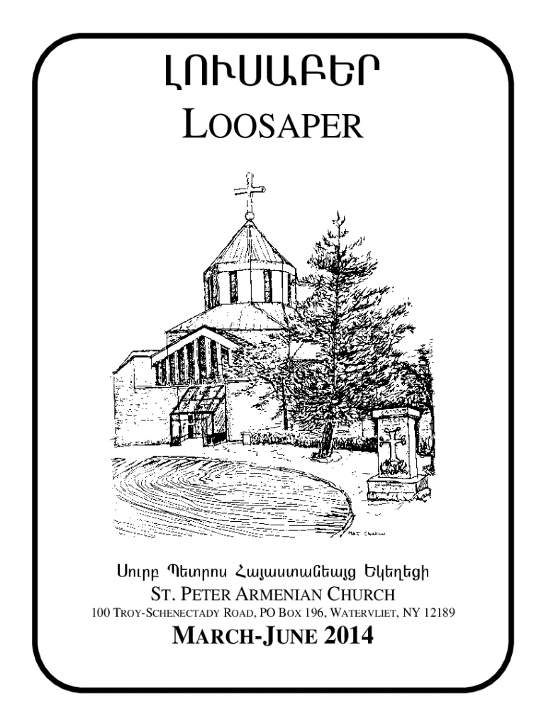 LOVSAPYR LOOSAPERSovrp Bydros Ha3asdanya3x Ygy.yxiST. PETER ARMENIAN CHURCH 100 TROYSCHENECTADY ROAD, PO BOX 196, WATERVLIET, NY 12189MARCHJUNE 2014St. Peter Armenian Apostolic Church 100 TroySchenectady Road P.O. Box 196 Watervliet, NY 12189 Phone: (518) 2743673 Fax: (518) 2743103 Email: stpeter.armch@prodigy.net Website: www.stpeterarmenianchurch.com * Join us on facebook * SUNDAY WORSHIP:Morning Services Divine Liturgy MondayFridayOFFICE HOURS:Rev. Fr. Stepanos Doudoukjian,