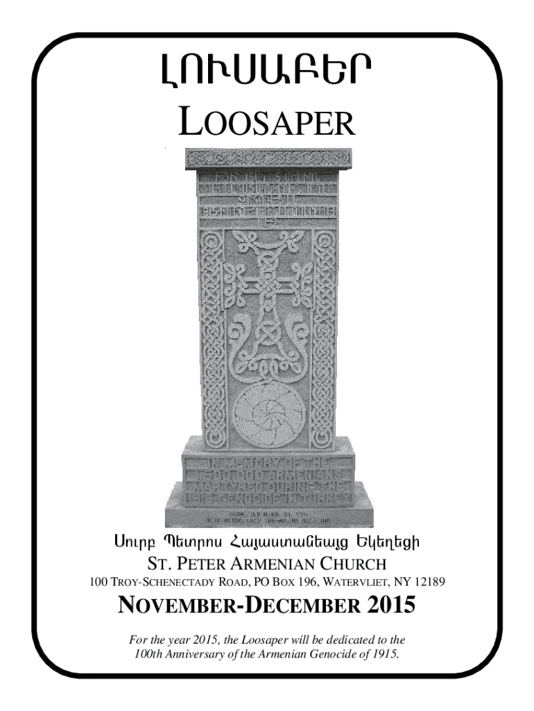 The Loosaper publication for St. Peter Armenian Church highlights events, community news, and the 100th Anniversary of the Armenian Genocide of 1915.