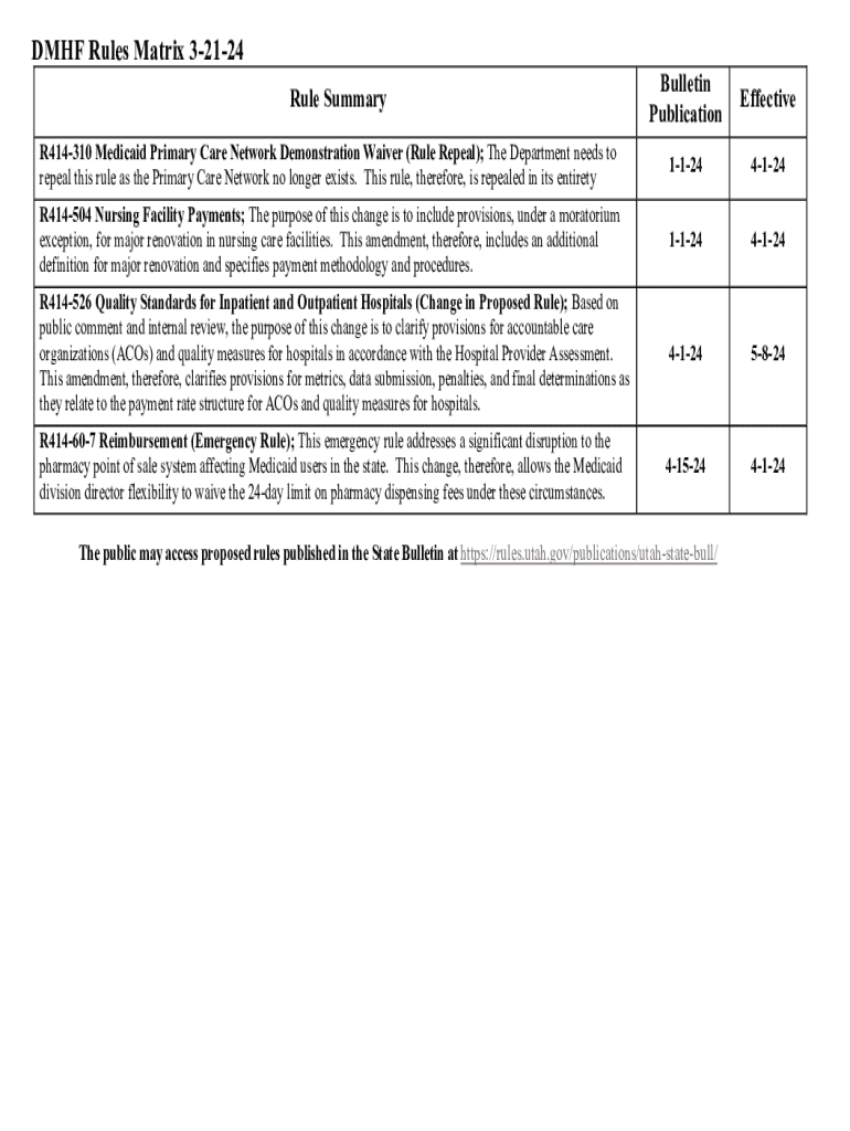 DMF Rules Matrix 32124Bulletin PublicationEffectiveR414310 Medicaid Primary Care Network Demonstration Waiver (Rule Repeal); The Department needs to repeal this rule as the Primary Care Network no