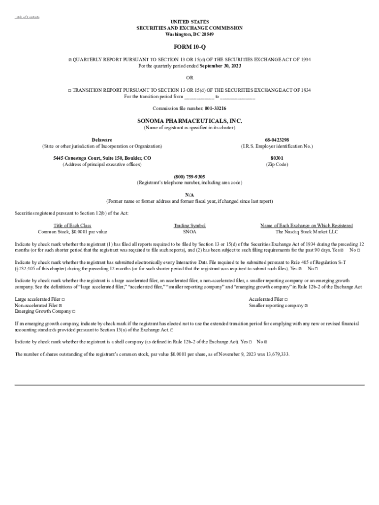 Table of ContentsUNITED STATES SECURITIES AND EXCHANGE COMMISSION Washington, DC 20549FORM 10Q QUARTERLY REPORT PURSUANT TO SECTION 13 OR 15(d) OF THE SECURITIES EXCHANGE ACT OF 1934 For the quarterly period ended September 30, 2023 OR TRANSITION REPORT PURSUANT TO SECTION 13 OR 15(d) OF THE SECURITIES EXCHANGE ACT OF 1934 For the transition period from ___ to ___ Commission file number: 00133216SONOMA PHARMACEUTICALS, INC. (Name of registrant as specified in its charter) Delaware (State