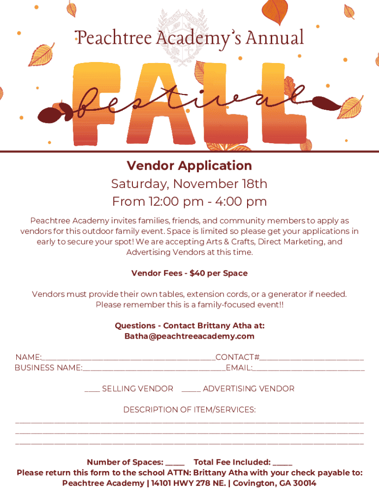 Apply now for the Peachtree Academy Annual Vendor Event. Limited spaces available for Arts & Crafts, Direct Marketing, and Advertising vendors.