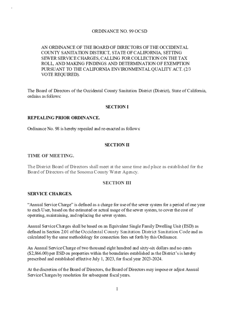 This ordinance sets annual sewer service charges and collection methods for the Occidental County Sanitation District for fiscal year 2023-2024.