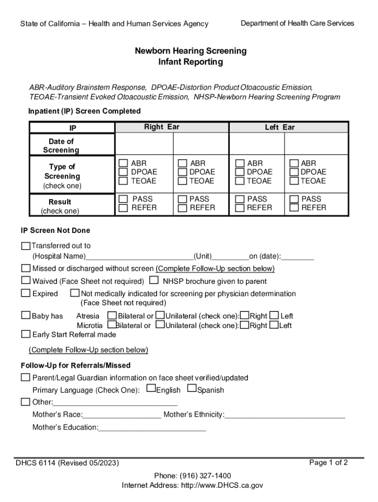 This document outlines the procedures and forms for Newborn Hearing Screening in California, ensuring accurate reporting and follow-up care for infants.