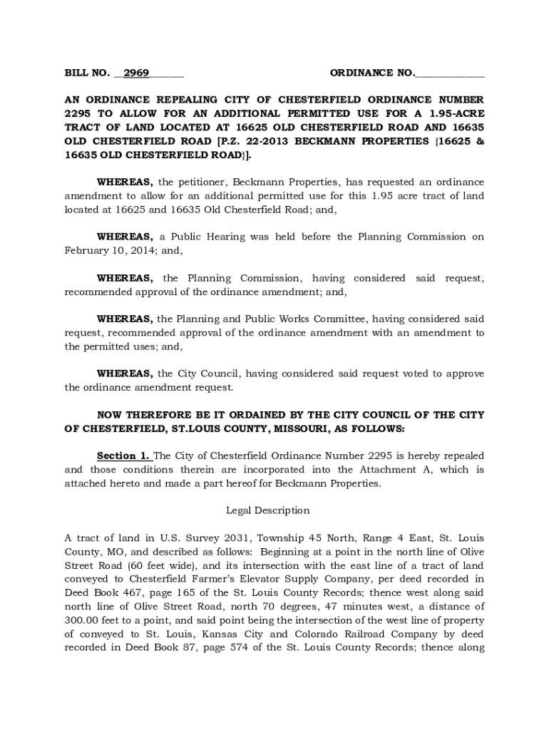 This document details the repeal of Ordinance 2295 and approval for additional uses at 16625 & 16635 Old Chesterfield Road, enhancing property development in 2014.