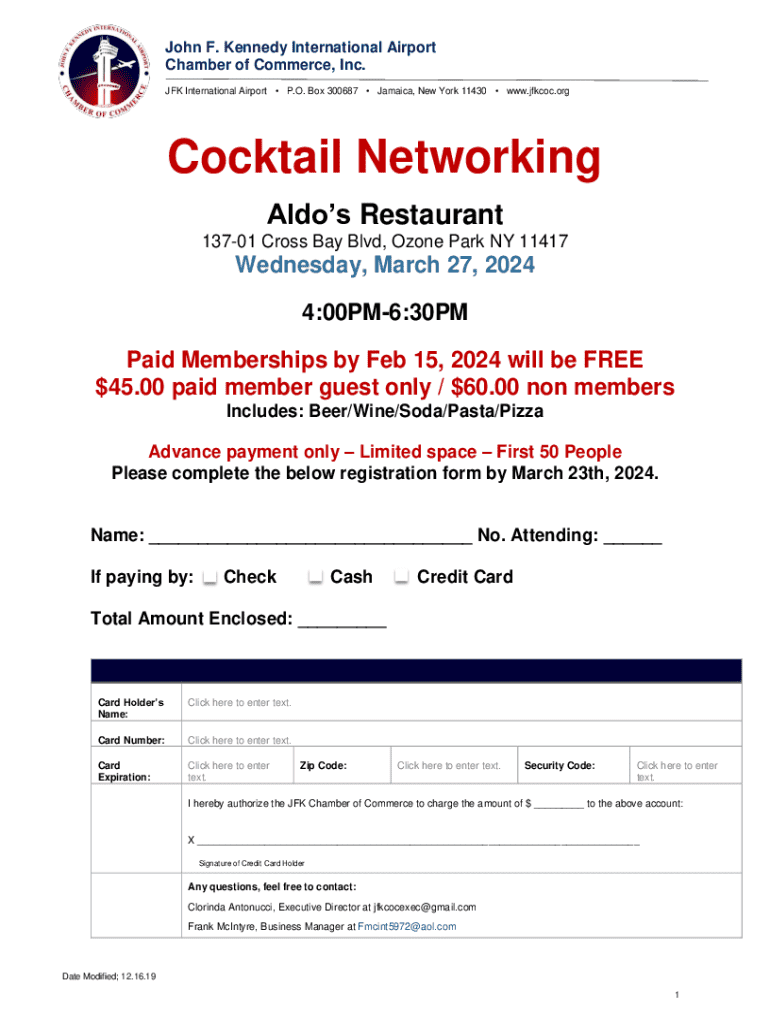 John F. Kennedy International Airport Chamber of Commerce, Inc. JFK International Airport P.O. Box 300687 Jamaica, New York 11430 www.jfkcoc.orgCocktail Networking Aldo's Restaurant 13701 Cross Bay