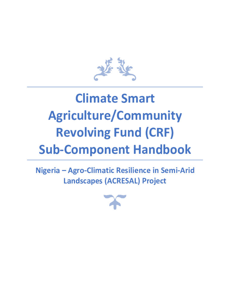 Climate Smart Agriculture/Community Revolving Fund (CRF) SubComponent Handbook Nigeria AgroClimatic Resilience in SemiArid Landscapes (ACRESAL) ProjectChapter 1: Subcomponent Overview The AgroClimaticResilience