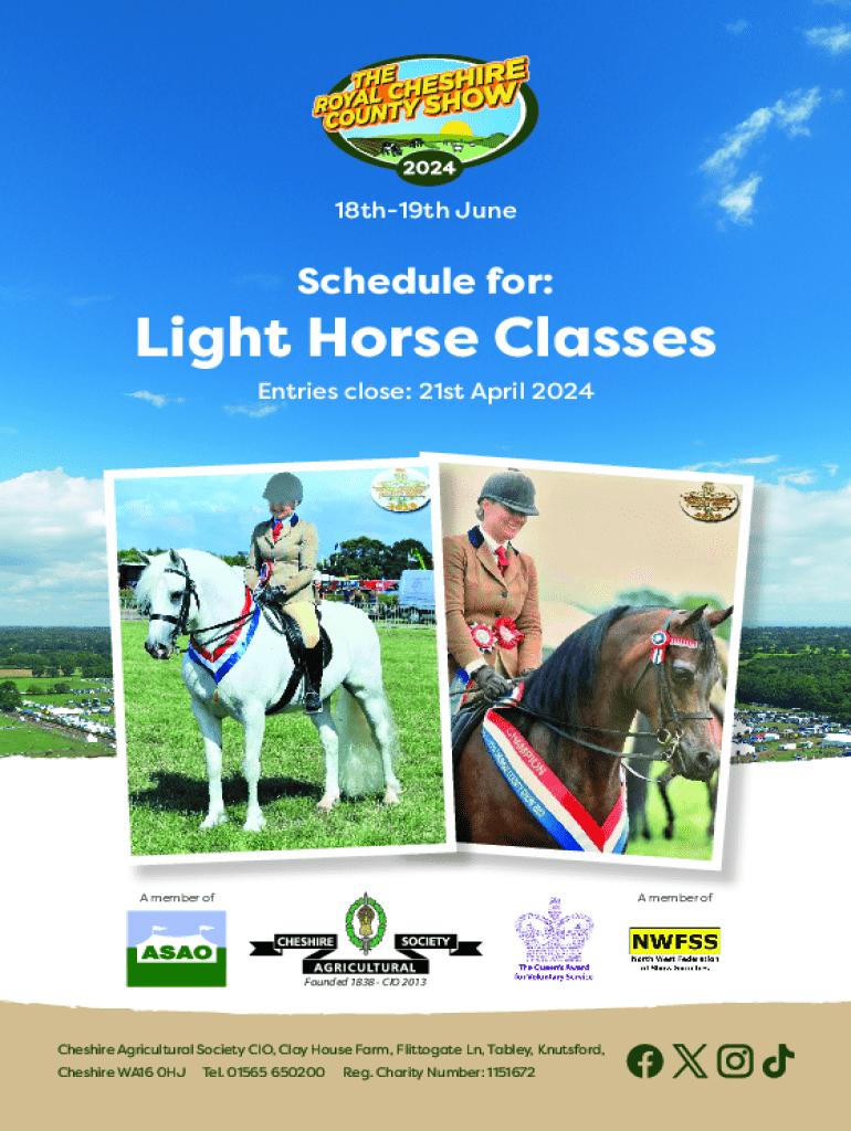 18th19th JuneSchedule for:Light Horse Classes Entries close: 21st April 2024A member ofA member ofFounded 1838 CIO 2013Cheshire Agricultural Society CIO, Clay House Farm, Flittogate Ln, Tabley, Knutsford, Cheshire WA16 0HJTel. 01565 650200Reg. Charity Number: 1151672Index to Sections Show Rules ........................................................................................................... 2 How to Make Your Entry, Stabling, Ticket allocation ....................
