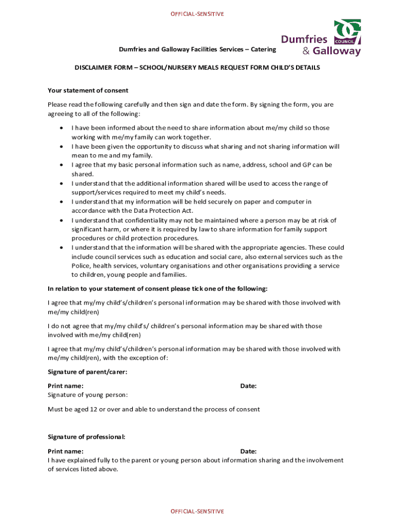 OFFICIALSENSITIVEDumfries and Galloway Facilities Services Catering DISCLAIMER FORM SCHOOL/NURSERY MEALS REQUEST FORM CHILDS DETAILS Your statement of consent Please read the following carefully and