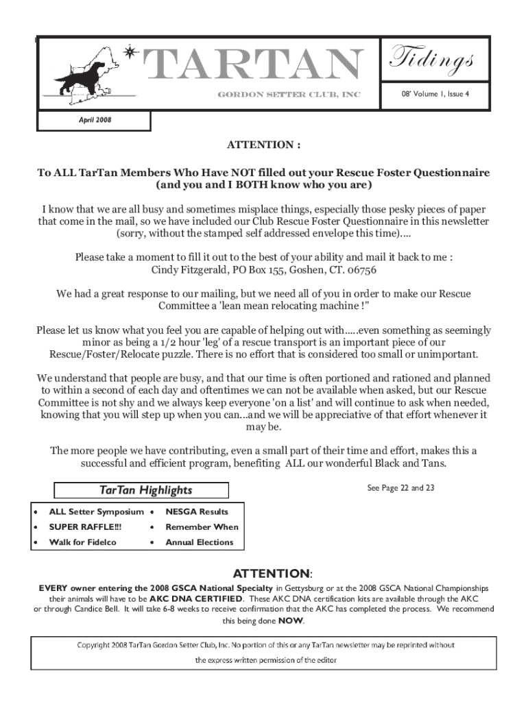 1TARTAN Gordon Setter Club, INCTidings 08 Volume 1, Issue 4April 2008ATTENTION : To ALL TarTan Members Who Have NOT filled out your Rescue Foster Questionnaire (and you and I BOTH know who you are)