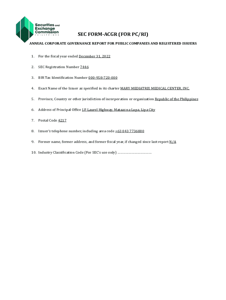 SEC FORMACGR (FOR PC/RI) ANNUAL CORPORATE GOVERNANCE REPORT FOR PUBLIC COMPANIES AND REGISTERED ISSUERS 1.For the *iscal year ended December 31, 20222.SEC Registration Number 74463.BIR Tax Identi*ication