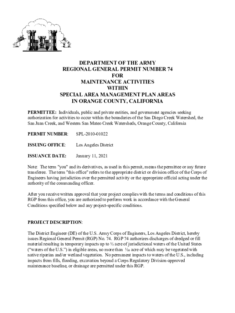 DEPARTMENT OF THE ARMY REGIONAL GENERAL PERMIT NUMBER 74 FOR MAINTENANCE ACTIVITIES WITHIN SPECIAL AREA MANAGEMENT PLAN AREAS IN ORANGE COUNTY, CALIFORNIA PERMITTEE: Individuals, public and private