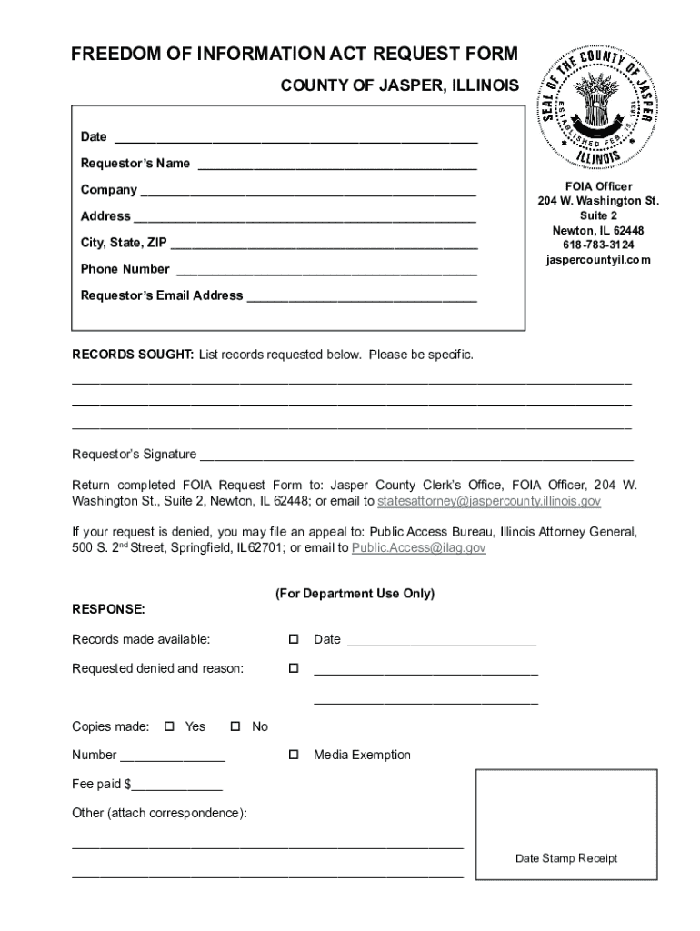 Submit a FOIA Request Form to Jasper County, Illinois to access public records. Ensure to provide detailed records sought for effective processing.