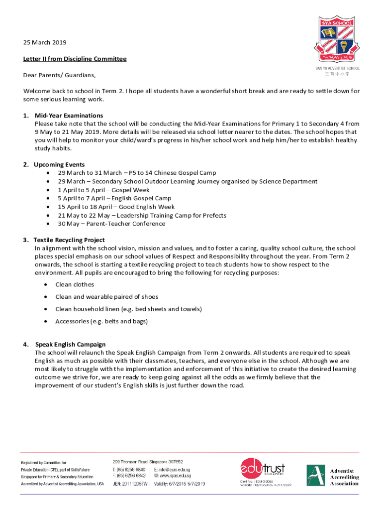 25 March 2019 Letter II from Discipline Committee Dear Parents/ Guardians, Welcome back to school in Term 2. I hope all students have a wonderful short break and are ready to settle down for some