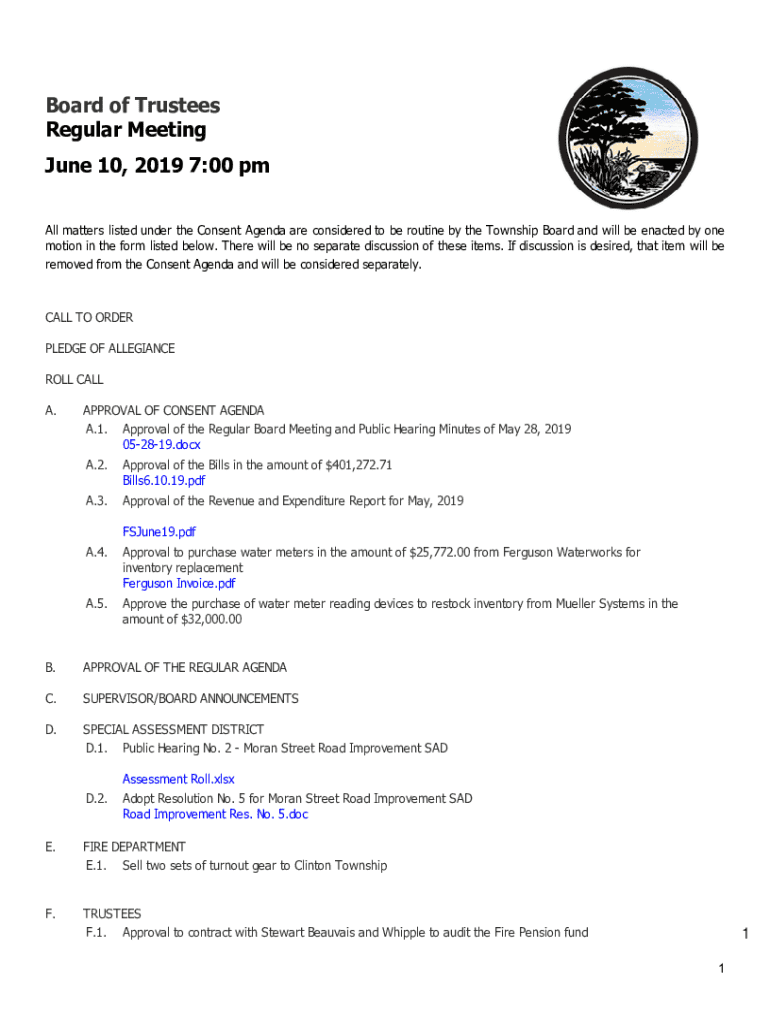 Board of Trustees Regular Meeting June 10, 2019 7:00 pm All matters listed under the Consent Agenda are considered to be routine by the Township Board and will be enacted by one motion in the form