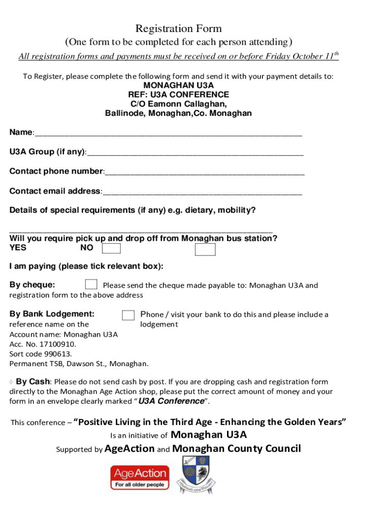 Register for the U3A Conference on Positive Living in the Third Age by completing this form. Ensure all details are submitted by October 11th, 2023.