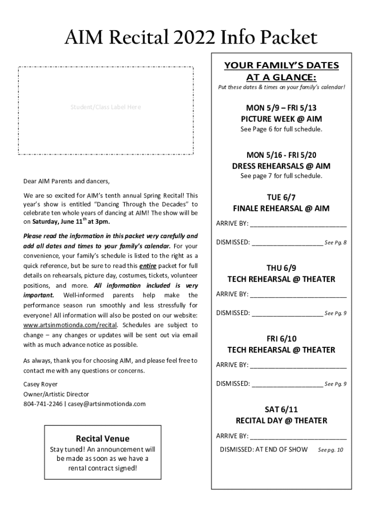 Stay informed with the AIM Recital 2022 Information Packet. Key dates, rehearsals, and essential details for a memorable dance recital at Arts in Motion.
