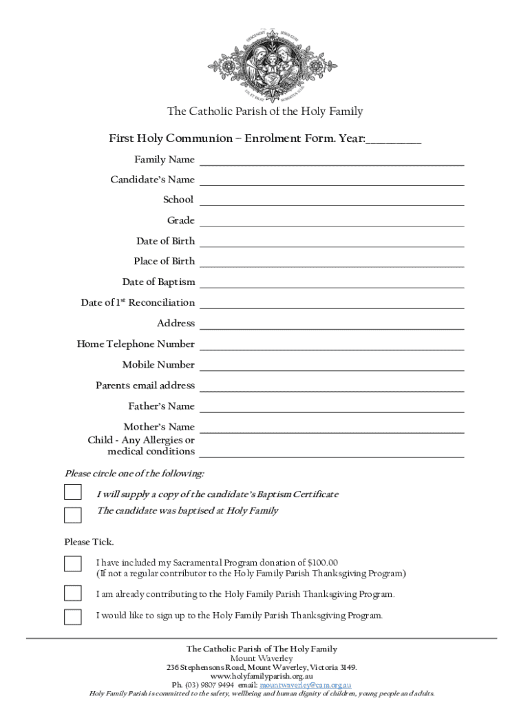 The first communion enrolment form is essential for families wishing to register their children for this sacrament. Eligibility typically includes children who have received baptism and are prepared to receive their First Holy Communion. While the standard age for this sacrament is usually around 7 to 9 years, each parish may have distinct age requirements and considerations based on local customs and community practices.