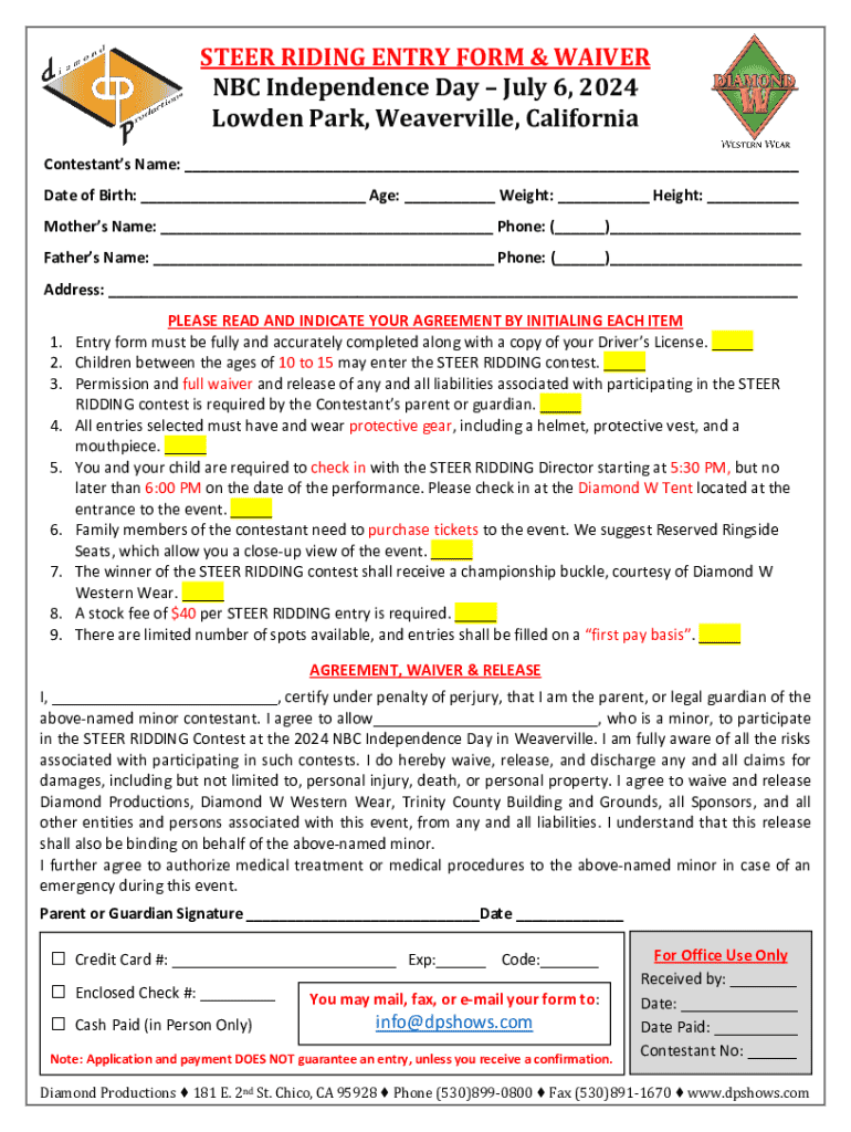 Get the free Steer Riding Application & Waiver - Diamond Productions