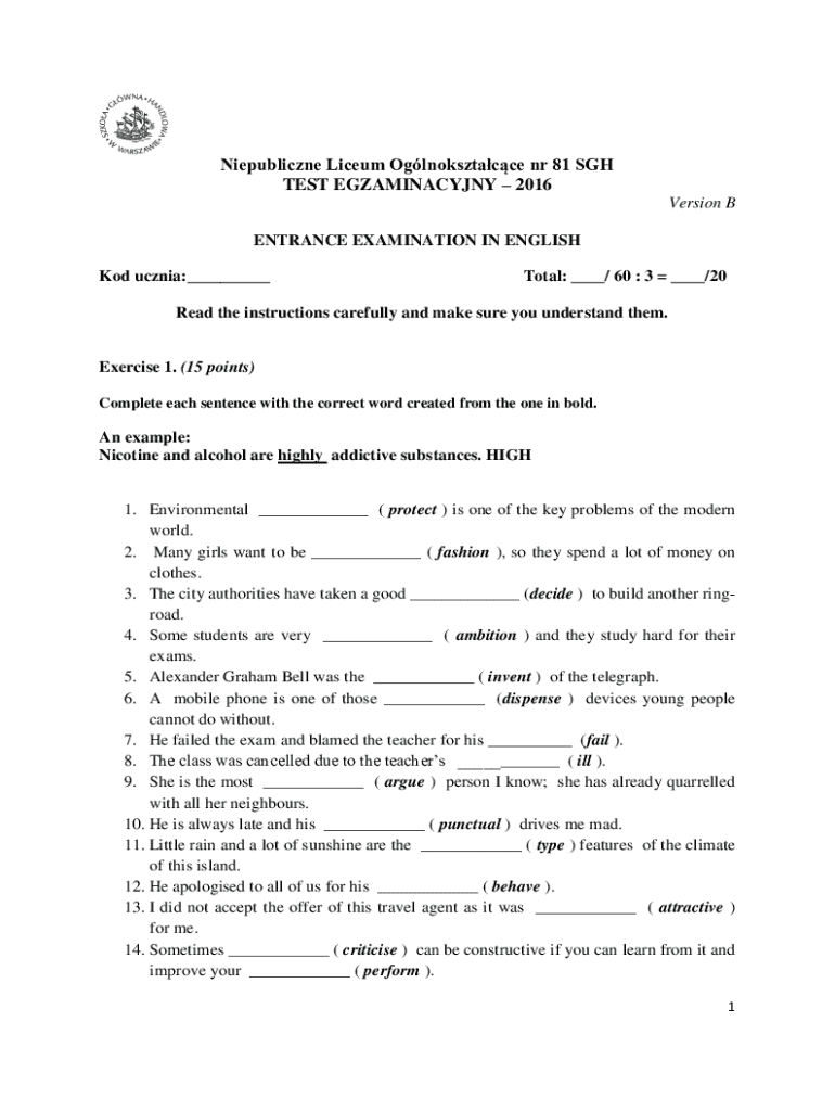 Niepubliczne Liceum Oglnoksztacce nr 81 SGH TEST EGZAMINACYJNY 2016 Version B ENTRANCE EXAMINATION IN ENGLISH Kod ucznia:___Total: ___/ 60 : 3 ___/20Read the instructions carefully and make sure you