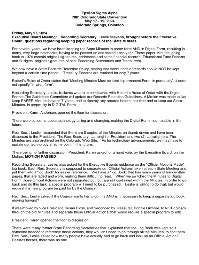 Epsilon Sigma Alpha 78th Colorado State Convention May 17 19, 2024 Colorado Springs, Colorado Friday, May 17, 2024 Executive Board Meeting: Recording Secretary, Leslie Stevens, brought before the